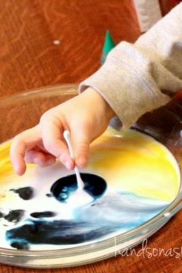 Pour the milk into a flat, wide dish (a pie dish works well). Add a few drops of food colouring to the milk – why not try using the primary colours to make it even more educational. Make the blobs of colour far from each other so that they don’t touch. Dip a q-tip into some dishwashing soap and use it as a magic wand by swirling it in the milk where you have blobs of colour. The soap will repel the colourant, creating patterns in the milk. It won’t be long before all the colours combine with each other.