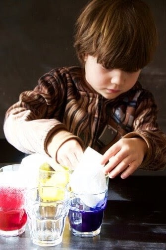 - Food dye or liquid water colors (red, yellow, and blue)