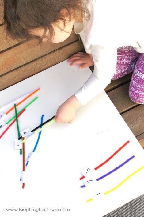 How to do it: Fold a piece of paper around one end of each pipe cleaner, securing it with a swipe of your glue stick. If it’s age-appropriate, write a number on each piece of paper. For children that are fairly number-literate, the pipe cleaners can be arranged in numerical order. Next, develop some fabulous fine motor skills by counting beads and threading them onto pipe cleaners. This activity is so varied and offers so many ways to practice number literacy and counting.