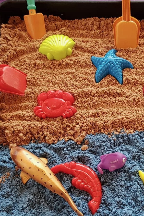 - Your choice of sand (e.g. beach sand, colored sand, kinetic sand)