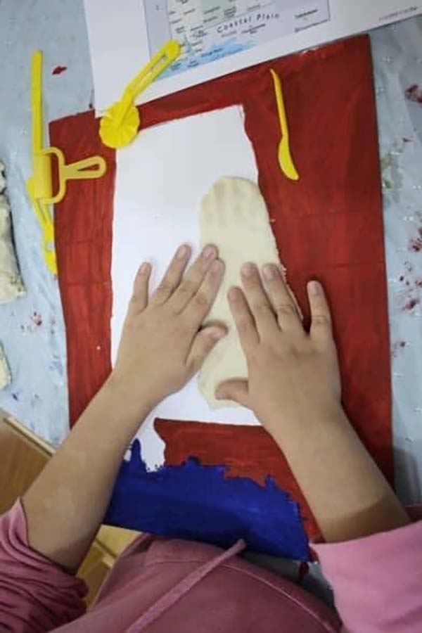 Help the children to combine the flour, salt, water, and cream of tartar with their hands, to make the salt dough. Apply a layer of dough to a cardboard base: Grab a clump of dough, and press it down onto the surface to flatten, or use tools, like a rolling pin. The children can get inspiration for landmarks from the illustrations, such as the trees and Max's tent. Once the dough is dry, the children can then paint each landmark.